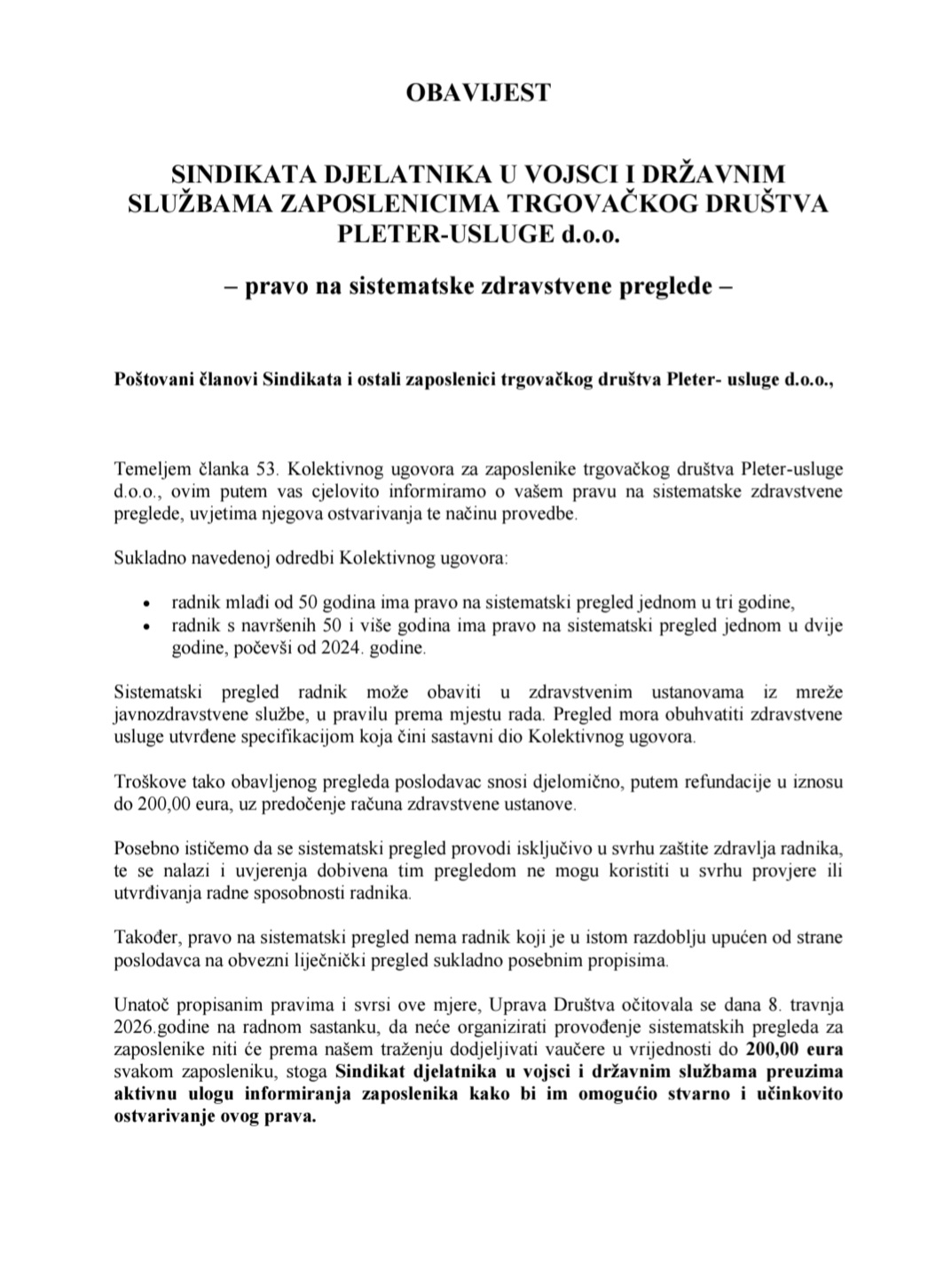 OBAVIJEST ZAPOSLENICIMA TRGOVAČKOG DRUŠTVA PLETER-USLUGE d.o.o.– pravo na sistematske zdravstvene preglede. Posted on 22 travnja, 2026Updated on 22 travnja, 2026by AdminKategorije:Vijesti Poštovani, u prilogu se nalazi obavijest zaposlenicima Pleter usluge d.o.o. po pitanju prava na sistematske zdrastvene preglede. Podijeli ovo! Facebook Twitter LinkedIn Admin www.sduvids.hr